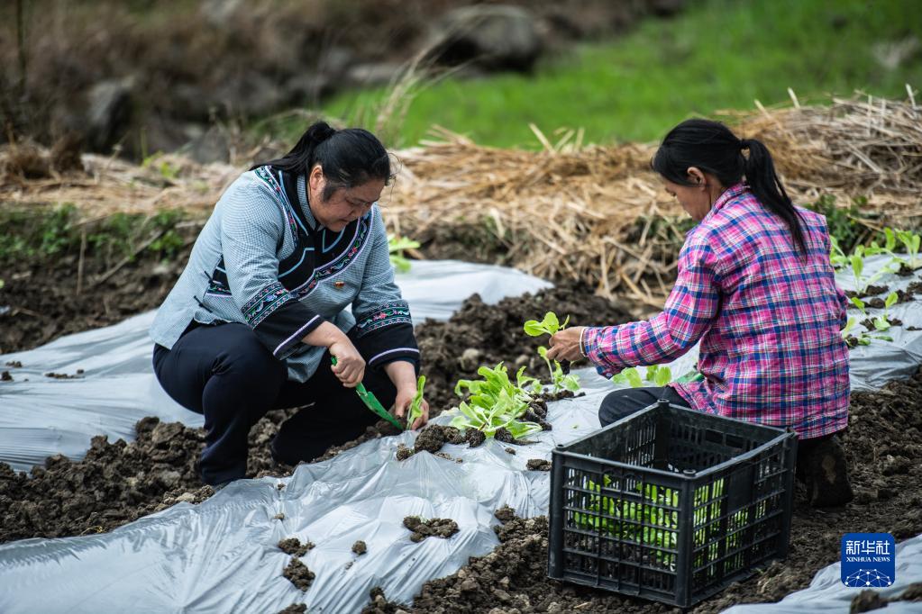 在贵州省罗甸县沫阳镇麻怀村,邓迎香(左)和村民一起种植白菜苗(2020年3月9日摄)。新华社记者 陶亮 摄