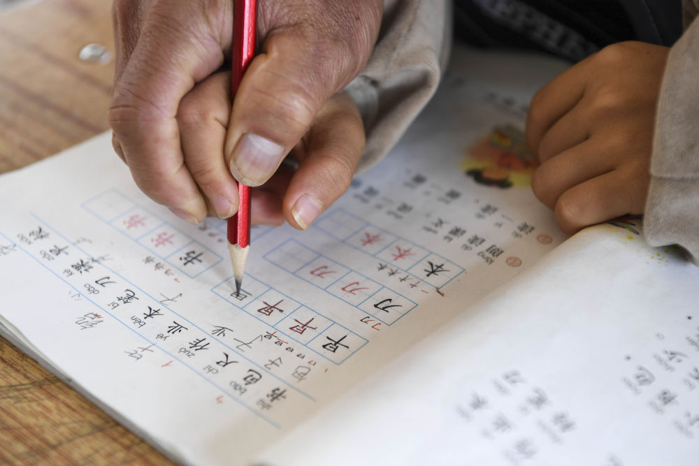 ↑2021年11月25日,在广西武宣县金鸡乡石祥小学,乡村教师贾福先手把手教学生写字。