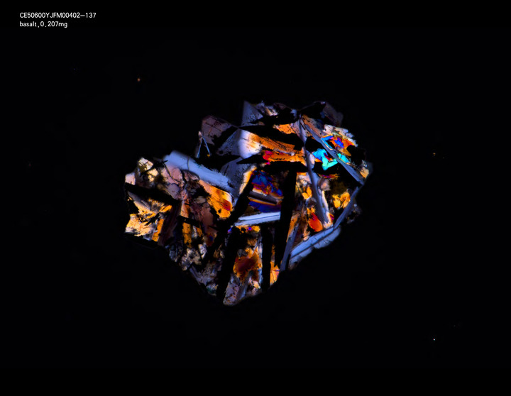 这是7月7日拍摄的嫦娥五号月壤中的一颗玄武岩碎片的正交偏光显微照片。(中科院地质与地球物理研究所供图)