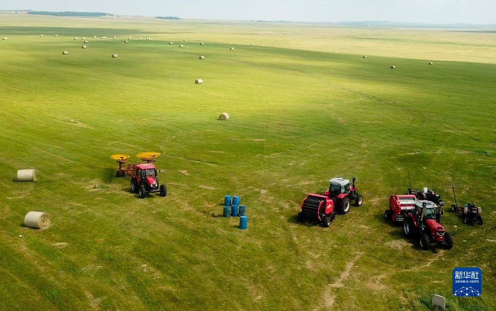 2022年7月25日,打草机在呼伦贝尔草原上打草(无人机照片)。新华社记者 彭源 摄
