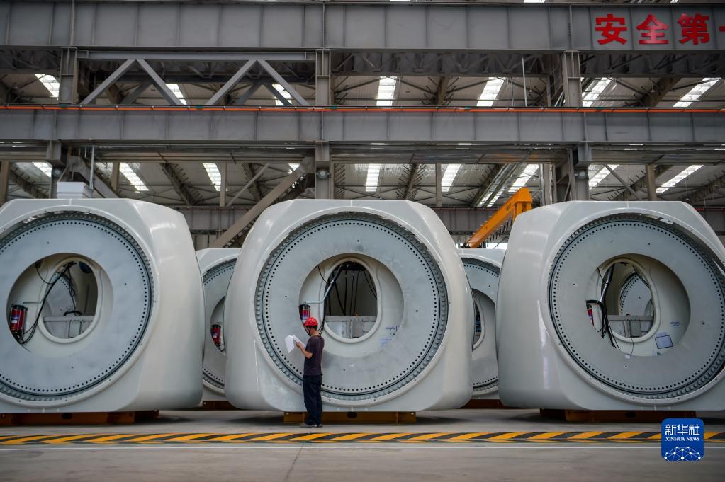2022年8月2日,工人在内蒙古乌兰察布市运达风电有限公司厂房里检查产品质量。新华社记者 李志鹏 摄