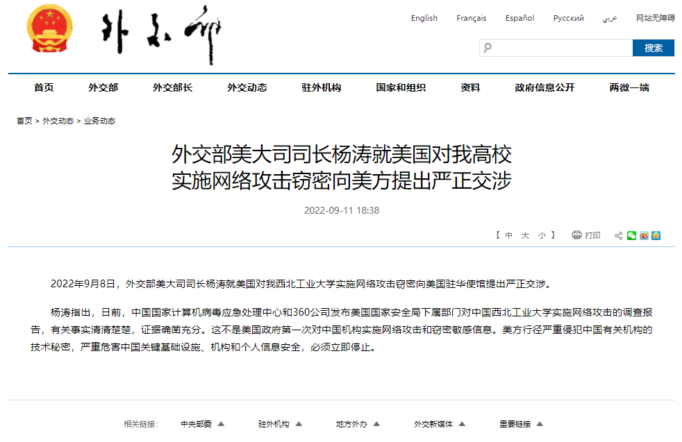 2022年9月8日,外交部美大司司长杨涛就美国对我西北工业大学实施网络攻击窃密向美国驻华使馆提出严正交涉。