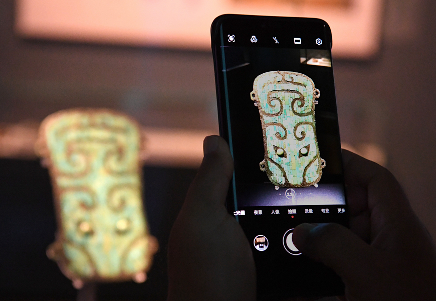 参观者在“中国百年百大考古发现展”上拍摄展品“镶嵌绿松石兽面纹铜牌饰”(9月4日摄)。新华社记者 李安 摄