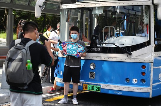 市民手持宣传牌在一辆上海20路新公交车前拍照 新华社记者方喆 摄