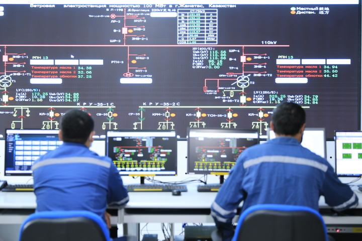 2021年5月24日,在哈萨克斯坦扎纳塔斯,扎纳塔斯风电公司运行值班人员在集中控制中心监控风电场设备运行状态。新华社发(奥斯潘诺夫摄)