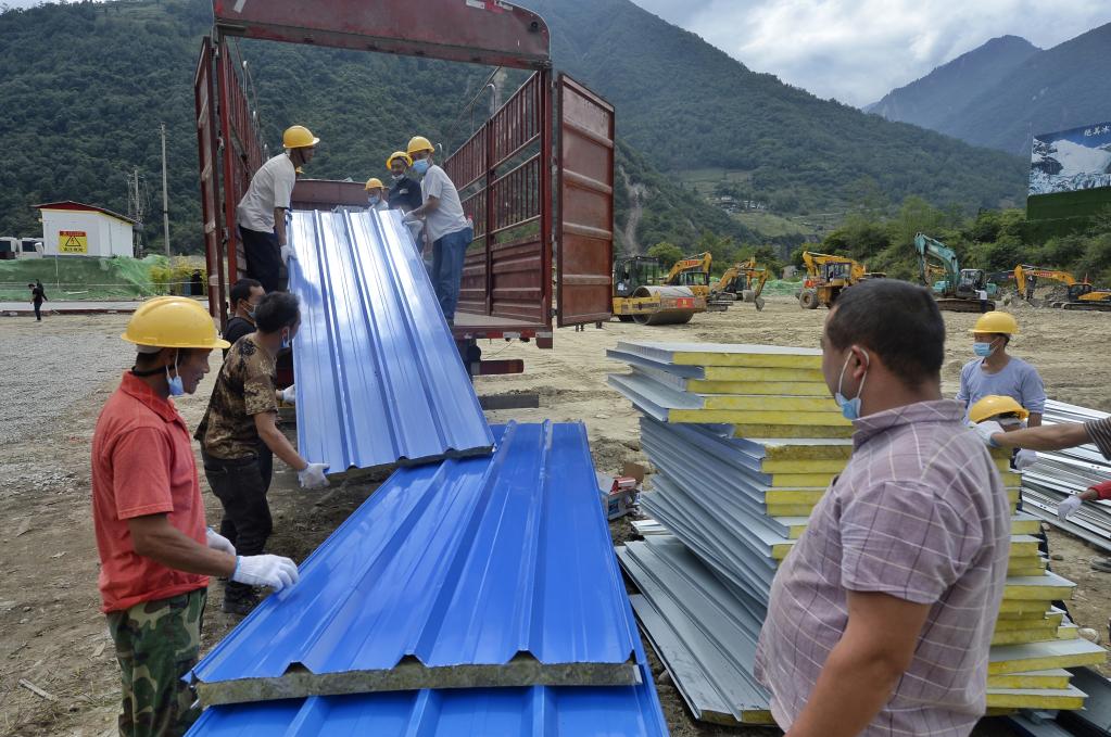 9月12日,泸定县“9·5”地震过渡安置房磨西镇安置点1号地块施工场地现场。新华社记者 刘坤 摄