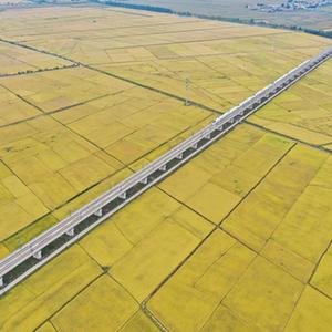 高铁列车从吉林省公主岭市沃野间驶过(2021年9月19日摄,无人机照片)。新华社记者 张楠 摄