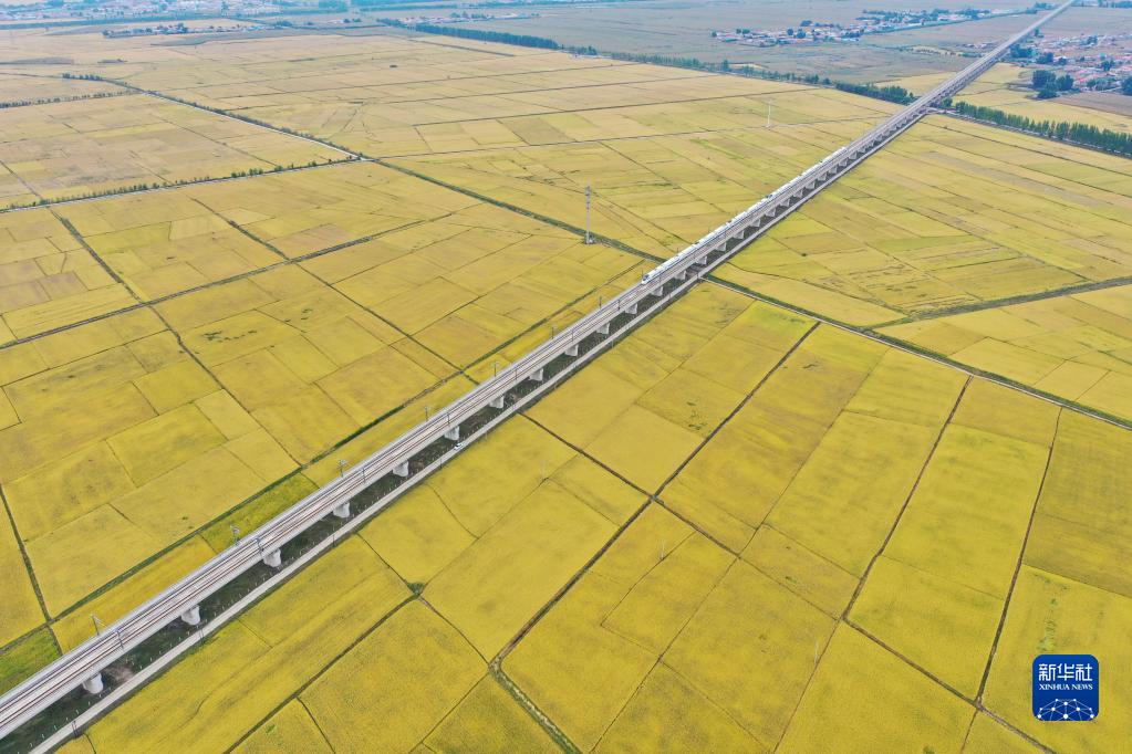 高铁列车从吉林省公主岭市沃野间驶过(2021年9月19日摄,无人机照片)。新华社记者 张楠 摄