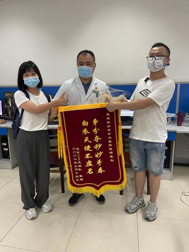 ↑冯先生的妻子和球队队长给袁医生送锦旗