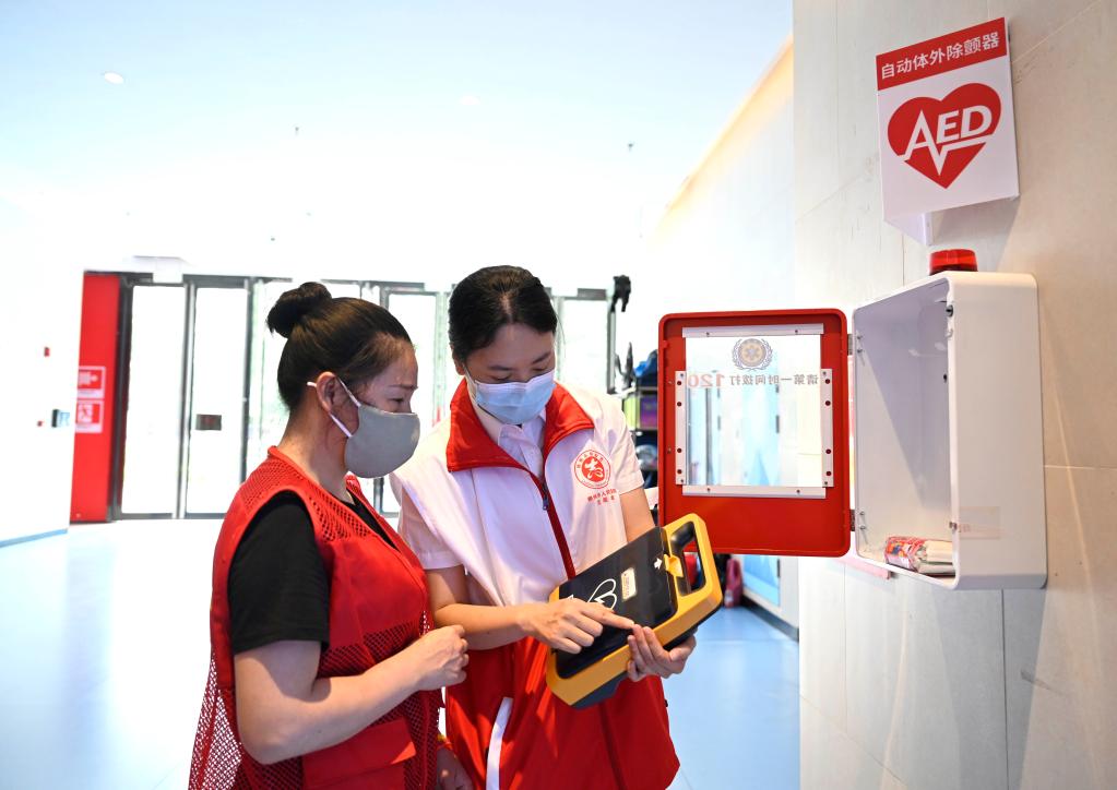 图为在广西柳州市康顺路一家大型商场,志愿者向市民普及AED(自动体外除颤器)使用技能。新华社发(黎寒池 摄)