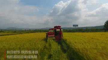 秋日时节,陕西省洋县有机稻田迎来成熟期,17.3万亩水稻喜获丰收,田野处处飘散着稻谷的芳香。