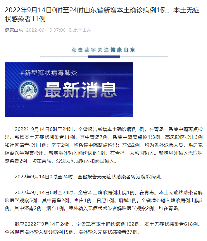 2022年9月14日0时至24时,山东省报告新增本土确诊病例1例,在青岛,系集中隔离点检出。新增本土无症状感染者11例,其中青岛7例,系集中隔离点检出3例、高风险区检出3例和社区筛查检出1例;济宁2例,均系集中隔离点检出;菏泽2例,均为省外返鲁人员,系居家隔离医学观察检出。新增境外输入确诊病例1例,在青岛,为韩国输入。新增境外输入无症状感染者2例,均在青岛,分别为韩国输入和泰国输入。
