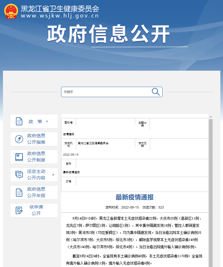 9月14日0-24时,黑龙江省新增本土无症状感染者22例,大庆市20例(高新区11例、龙凤区7例、萨尔图区1例、让胡路区1例),其中集中隔离发现18例、管控人群筛查发现2例;黑河市2例(均在爱辉区),均为集中隔离发现。当日治愈出院本土确诊病例15例(哈尔滨市7例,大庆市5例,绥化市3例),解除医学观察本土无症状感染者149例(大庆市140例,哈尔滨市5例,绥化市4例)。当日治愈出院境外输入确诊病例2例。