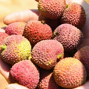 在海南省文昌市东路镇南排村荔枝园,果农展示刚摘下来的新鲜荔枝。新华社记者杨冠宇 摄