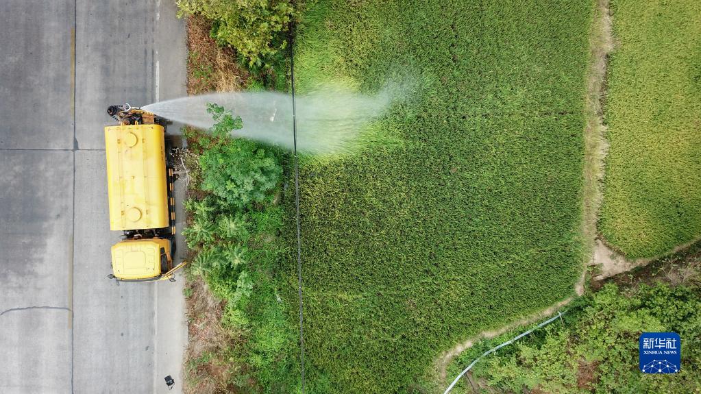 9月15日,在湘潭市雨湖区姜畲镇联映村,洒水车在对道路沿线稻田进行灌溉(无人机照片)。