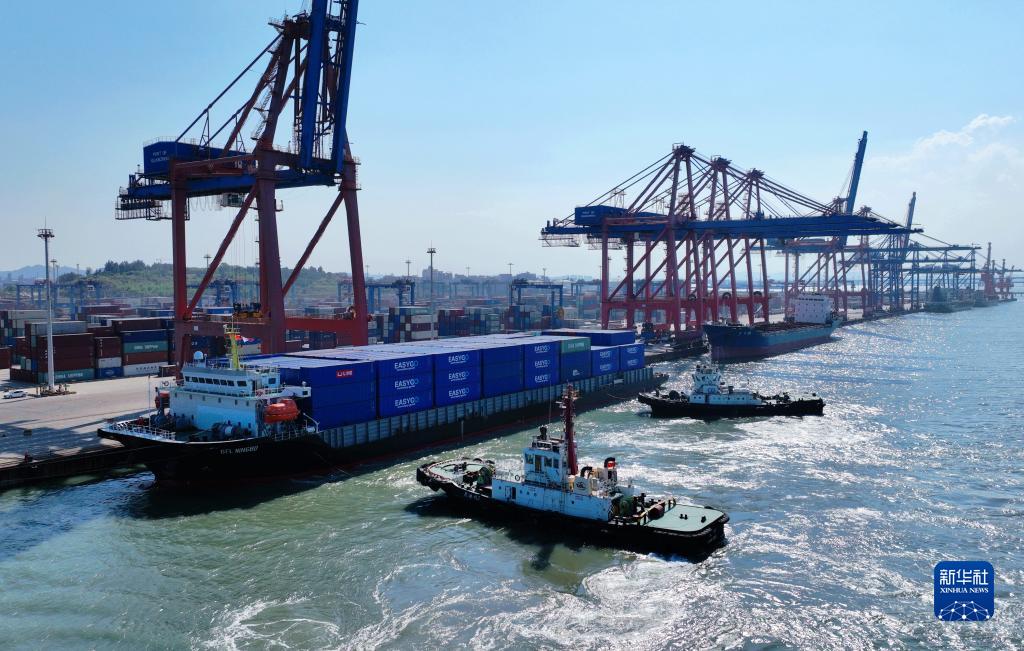 9月15日,在两艘拖轮的帮助下,“沃德菲宁波”号集装箱轮缓缓驶出泉州港石湖码头(无人机照片)。