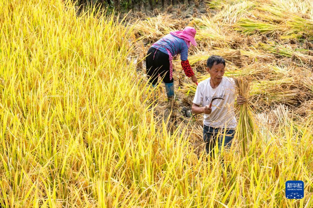 9月14日,在重庆市酉阳土家族苗族自治县花田乡,稻农在稻田里抢收稻谷。 新华社记者 唐奕 摄
