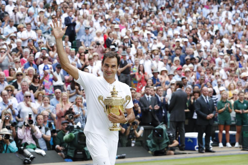 图为在2017年7月16日举行的温布尔登网球公开赛男单决赛中,费德勒以3:0战胜克罗地亚选手西里奇,第八次获得温网冠军。新华社记者韩岩 摄