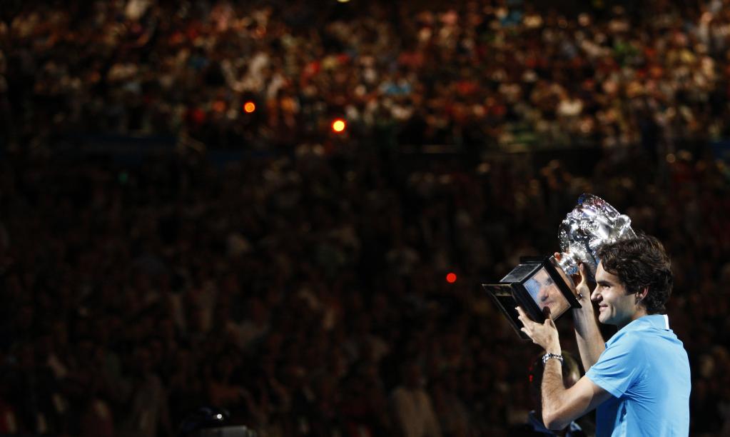 图为在2010年1月31日举行的澳大利亚网球公开赛男单决赛中,费德勒以3:0战胜英国选手穆雷,第四次夺得澳网冠军。新华社记者王丽莉 摄