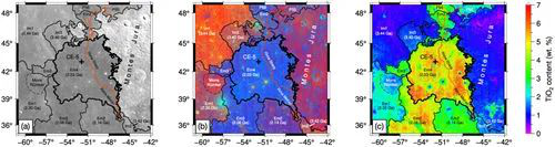 (a)嫦娥五号着陆区光学影像。(b)嫦娥五号着陆区假彩色波段合成影像。(c)嫦娥五号着陆区钛含量分布图。(中科院国家空间科学中心供图)