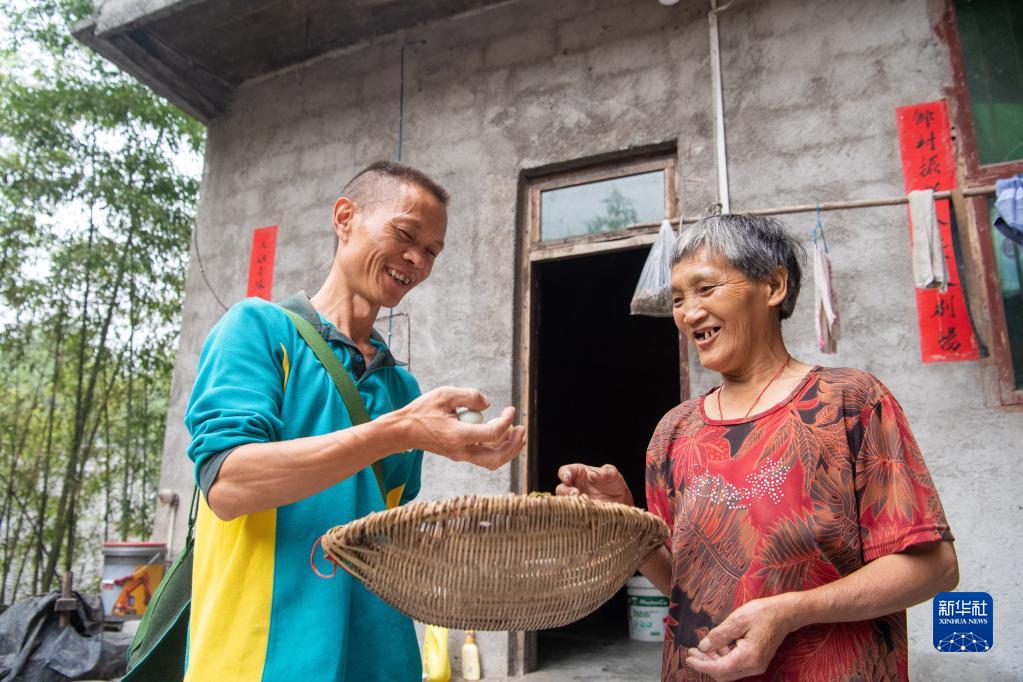 9月15日,投递员张永洪(左)在村民家收取村民外销的农产品。