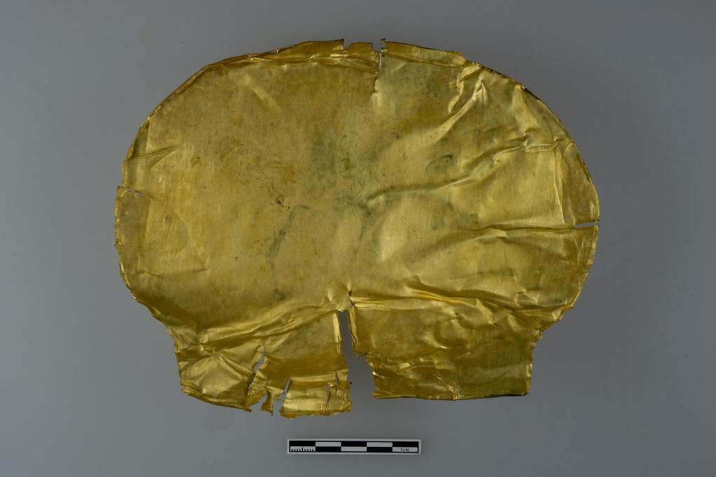 2号墓(M2)是郑州商城遗址考古发现等级最高的墓葬,墓口长2.93米,墓葬中间发现疑似朱砂的红褐色遗迹现象,墓内出土各类器物200余件,其中青铜礼器、兵器20件,玉器11件、金器5件,另有贝币123枚、绿松石管珠、镶嵌绿松石的牌饰等,充分彰显了墓主人的高等级贵族身份。