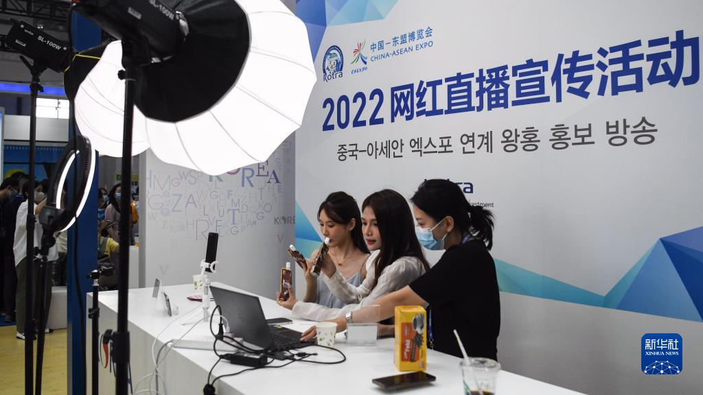 9月16日,在南宁国际会展中心韩国展馆,三名工作人员在进行直播。
