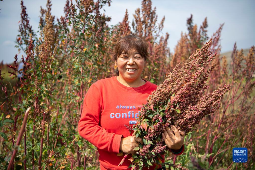 在静乐县娘子神乡南舍村,村民展示刚收割的藜麦(9月16日摄)。