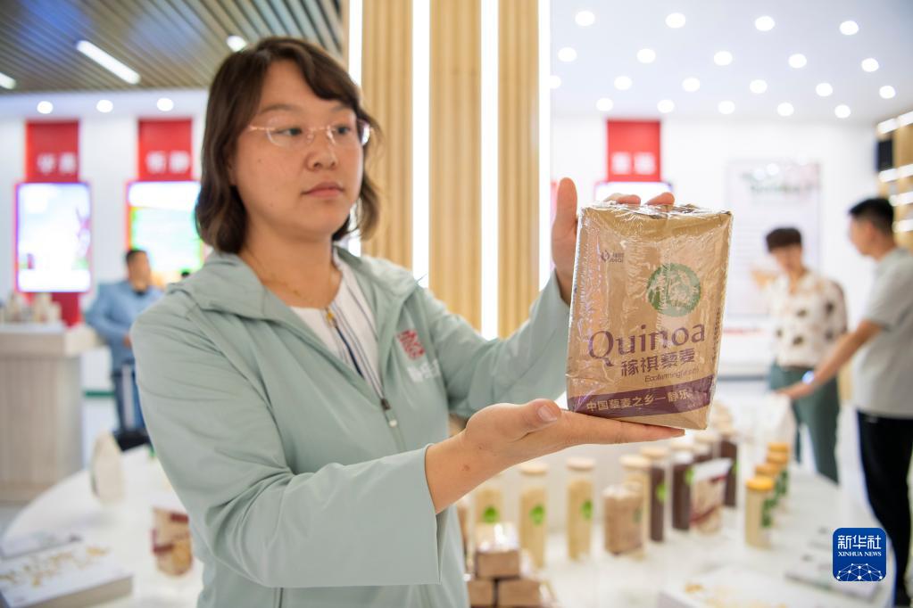 在静乐县中国藜麦之乡产业园,工作人员展示一款藜麦产品(9月15日摄)。