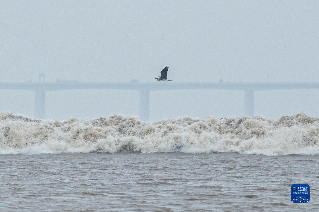 一只水鸟在钱塘江潮水上空飞舞(9月13日摄)。今年,受台风“梅花”影响,钱塘江在风雨之中迎来大潮。