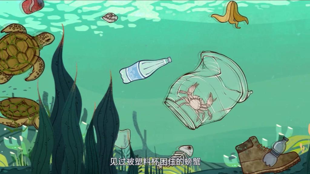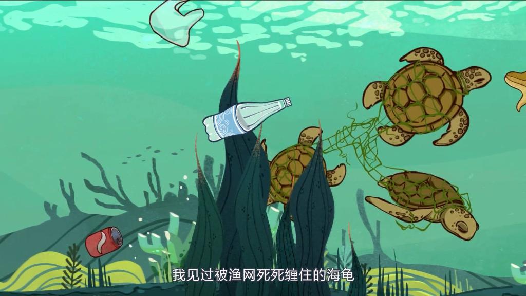 一个塑料矿泉水瓶被人类随意丢弃后,在海洋中漂泊,看到了被渔网死死缠住的海龟;