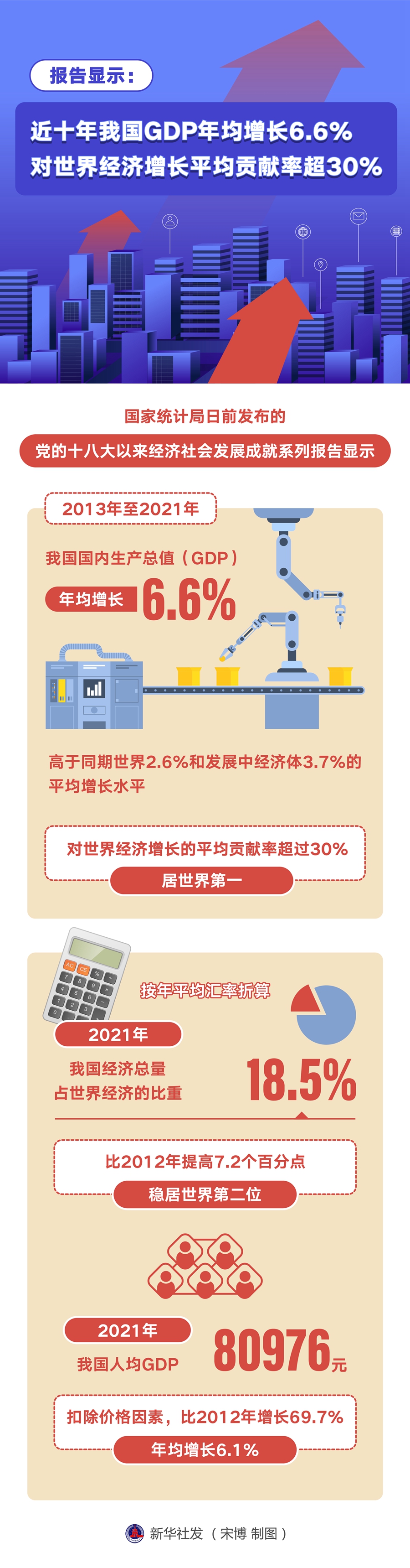 根据报告,按年平均汇率折算,2021年我国经济总量占世界经济的比重达18.5%,比2012年提高7.2个百分点,稳居世界第二位。2021年,我国人均GDP达80976元,扣除价格因素,比2012年增长69.7%,年均增长6.1%。