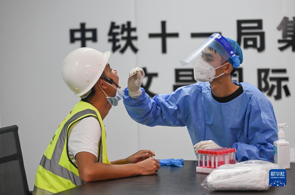 9月17日,工人在位于海南文昌的卫星总装测试厂房项目部接受核酸检测。