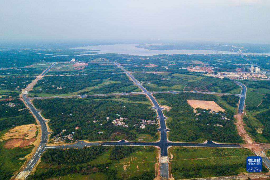 这是建设中的文昌国际航天城起步区“三横五纵”路网工程项目(无人机照片,9月14日摄)。