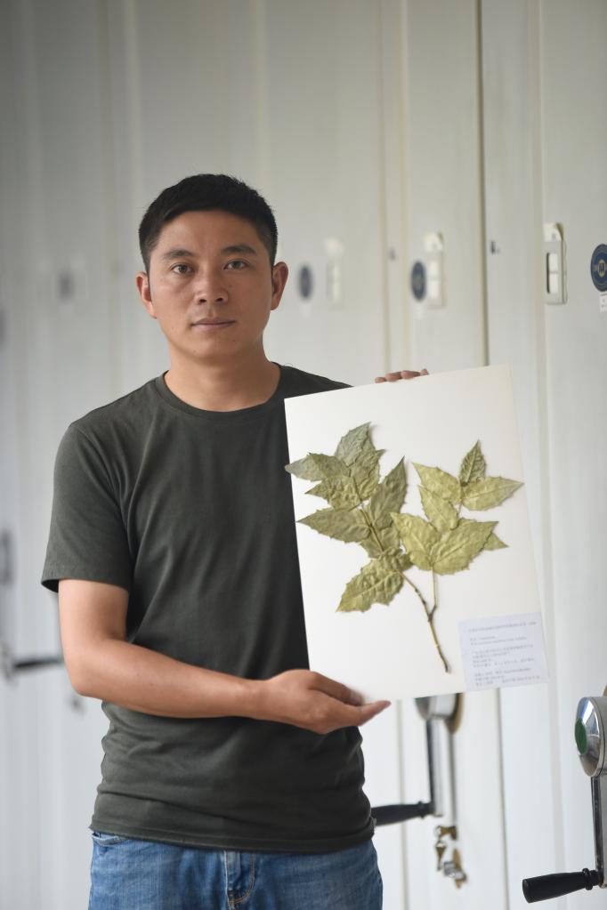 胡君展示他采集的尖齿卫矛标本(8月17日摄)。新华社记者 刘坤 摄