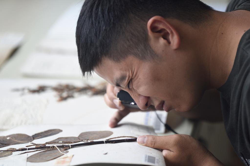 胡君用放大镜观察标本(8月17日摄)。新华社记者 刘坤 摄