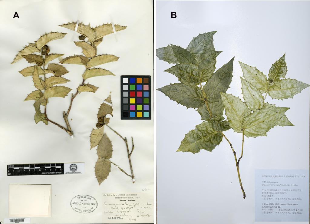 图为尖齿卫矛蜡叶标本照片,左边为1908年采集到的主模式标本,右边为胡君等人2021年新采集的标本。受访者供图