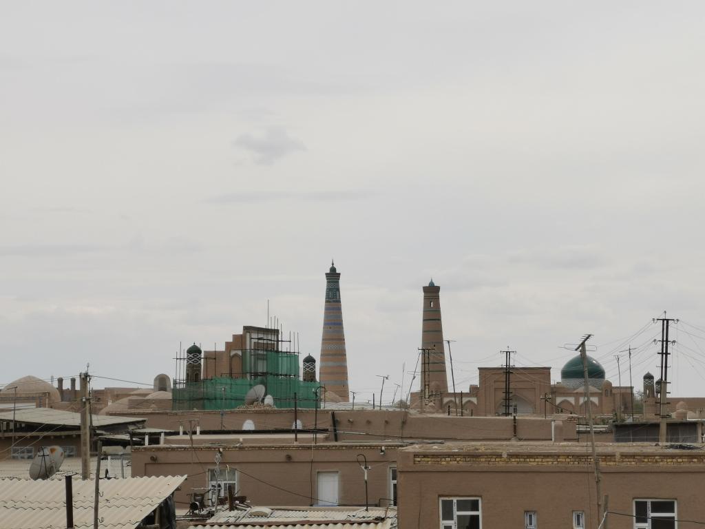 这是2019年4月23日在乌兹别克斯坦希瓦古城城墙上拍摄的远处的经学院。新华社记者 蔡国栋 摄