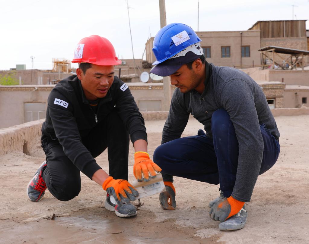 2019年4月22日,在乌兹别克斯坦希瓦古城哈桑·穆拉德库什别吉清真寺,中方文物修复人员正在指导乌方工作人员修复清真寺屋顶。新华社记者 蔡国栋 摄
