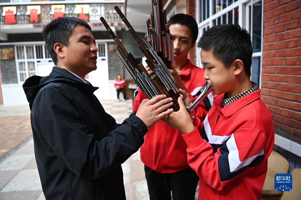 在陵川县盲人曲艺宣传队院子里,老队员张学敏(左)指导小队员练习乐器(9月15日摄)。
