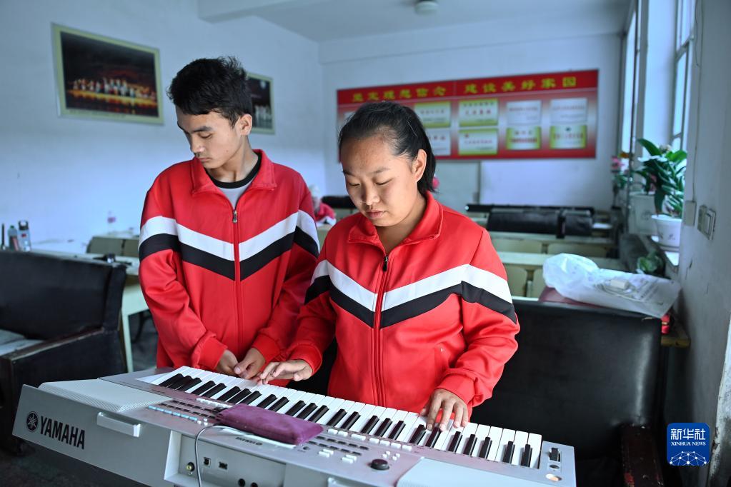 陵川县盲人曲艺宣传队两名队员在排练室练习电子琴(9月15日摄)。