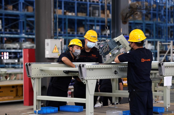 2022年5月31日,在安徽合肥新站高新区一家智能科技产品生产企业,工人在产品装配生产线上作业。新华社发(解琛 摄)