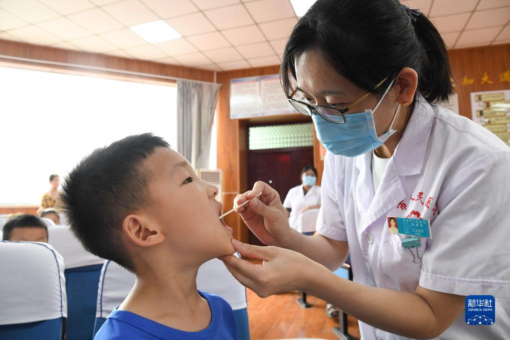 9月19日,在河南省济源市济水东园学校,济源市人民医院口腔科医生为小学生检查口腔健康状况。
