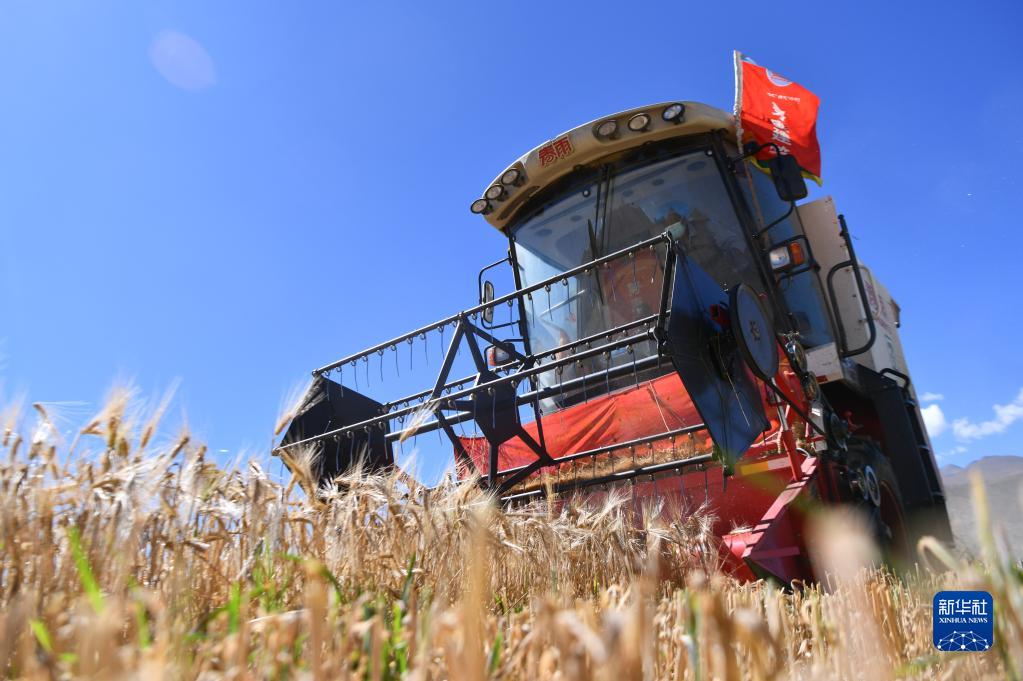 西藏日喀则市江孜县热索乡努康村农机合作社的村民集中对村里三千多亩耕地进行机械化收割(9月19日摄)。