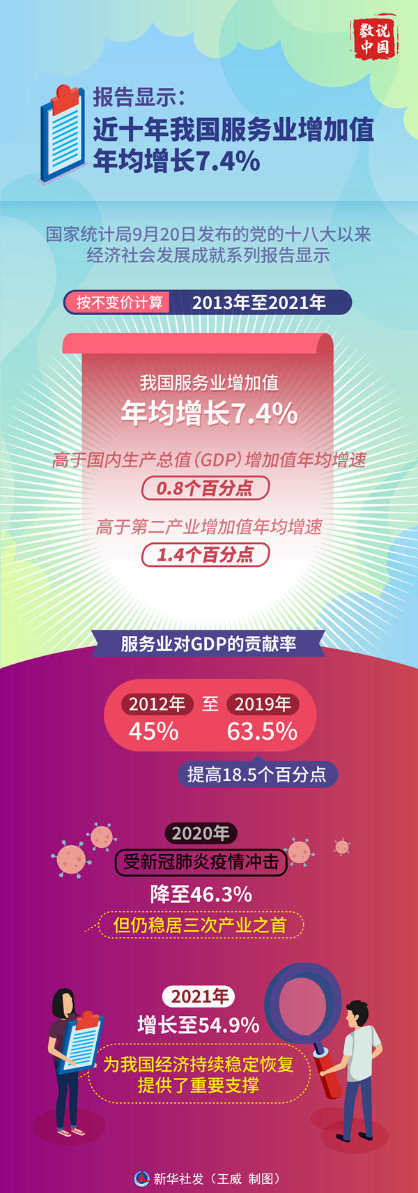新华社北京9月20日电(记者魏玉坤)国家统计局20日发布的党的十八大以来经济社会发展成就系列报告显示,按不变价计算,2013年至2021年,我国服务业增加值年均增长7.4%,分别高于国内生产总值(GDP)和第二产业增加值年均增速0.8和1.4个百分点。