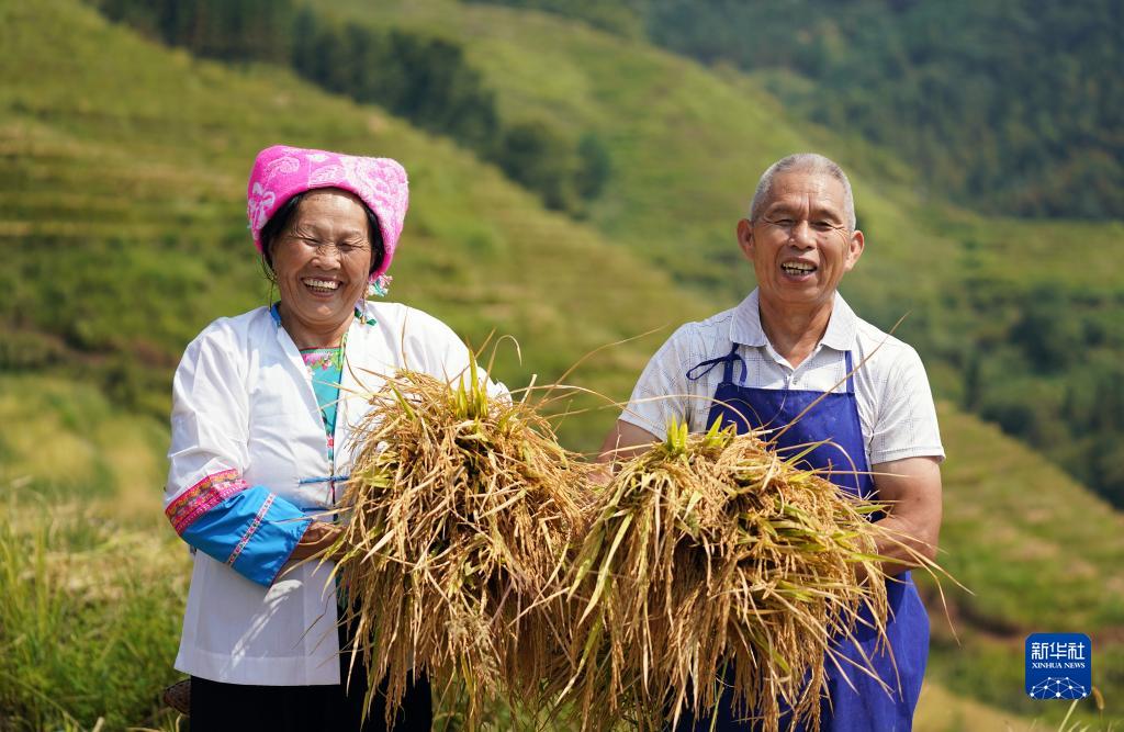 9月14日,在广西龙胜各族自治县龙脊镇龙脊古壮寨,壮族群众捧着刚刚收获的稻谷。