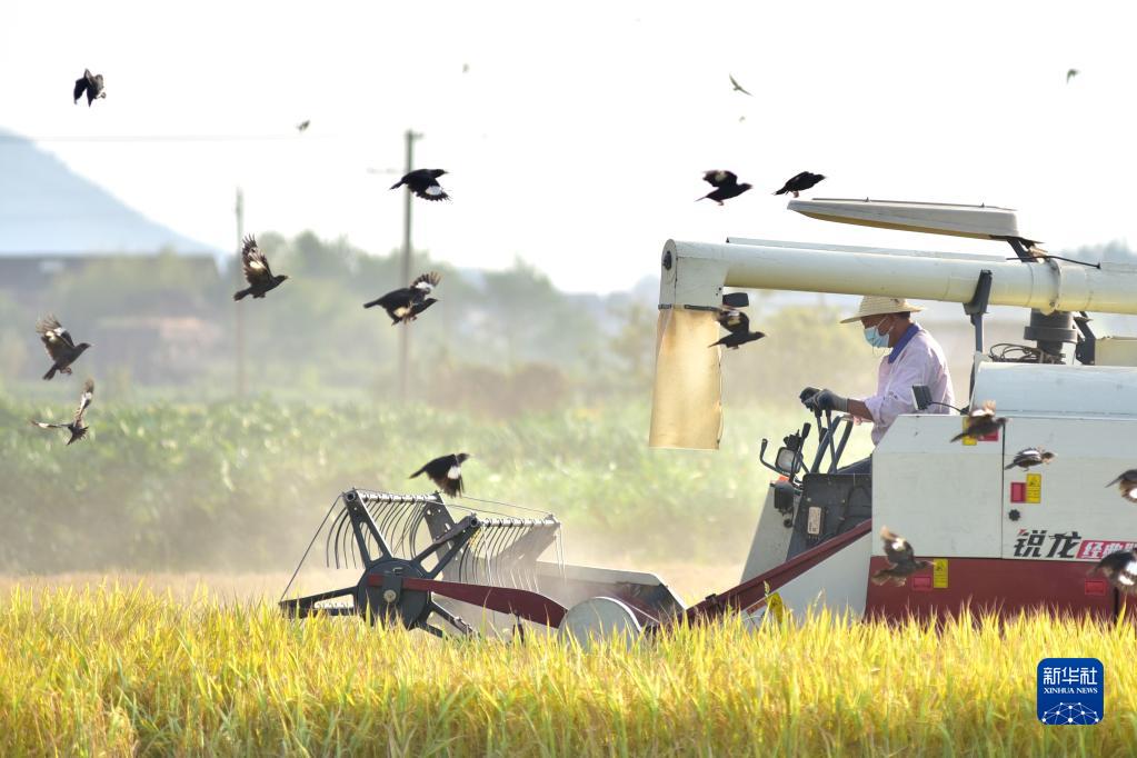 9月14日,在湖南省双峰县永丰街道泥湾村高标准农田项目建设区,农民驾驶收割机收割水稻。