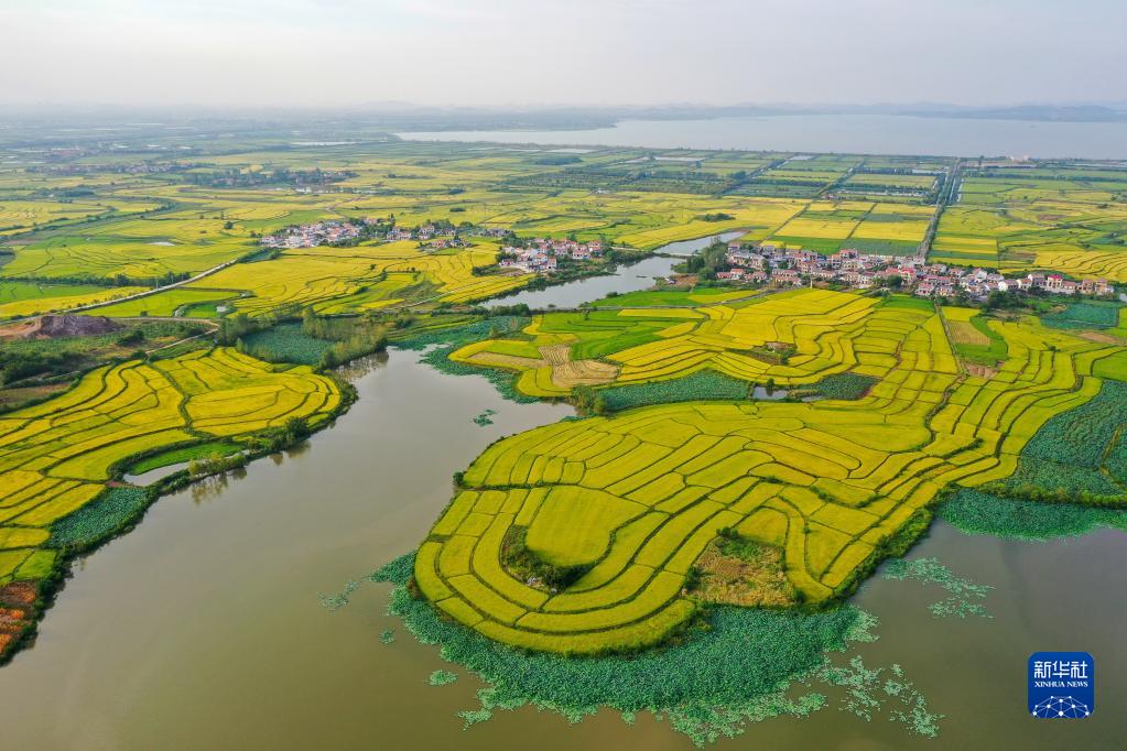 9月9日在湖北武汉江夏区法泗镇拍摄的进入成熟期的稻田(无人机照片)。