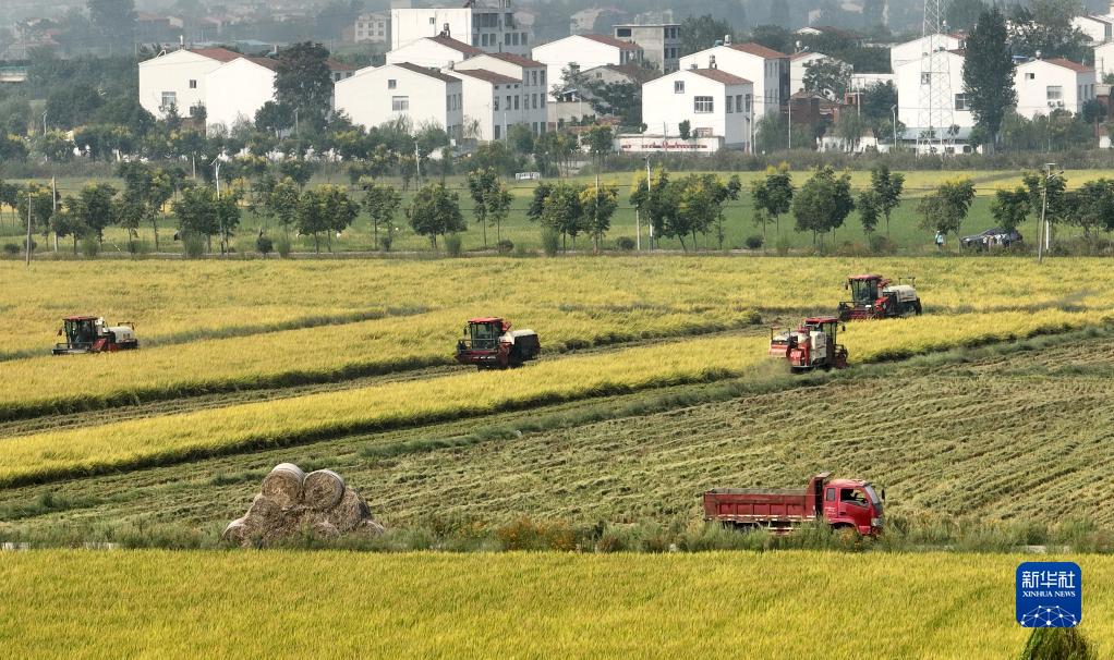 9月14日,在湖北省襄阳市襄州区张家集镇,一家农机专业合作社的联合收割机在收水稻(无人机照片)。