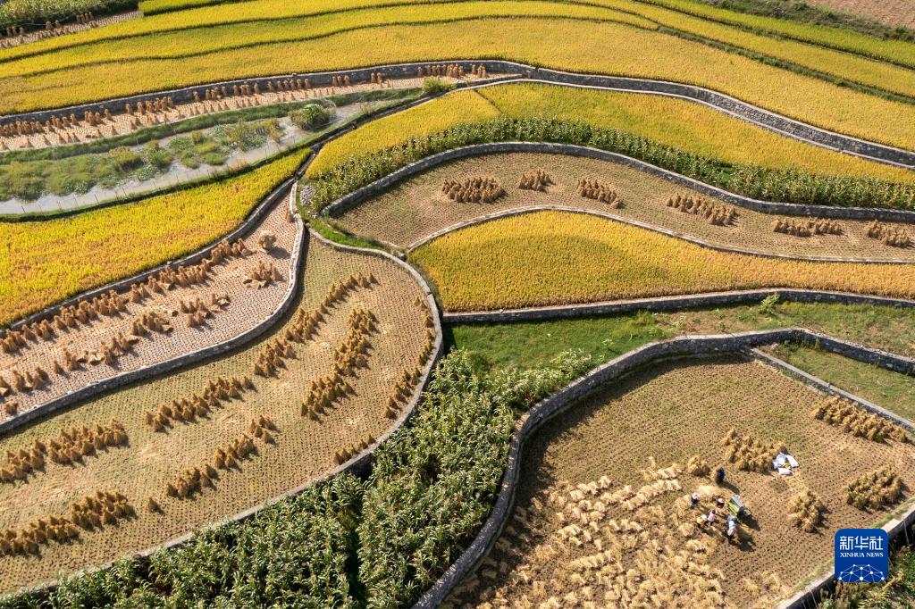 9月19日,在贵州省毕节市百里杜鹃管理区黄泥乡朝门村,农民在收割水稻(无人机照片)。
